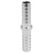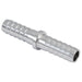 Stainless steel joiner fitting for joining multiple lengths of tubing, recommended for 3/16" to 1/4" ID tubing with barbs slightly undersized at 6 mm (0.24"), made from 304 stainless steel.